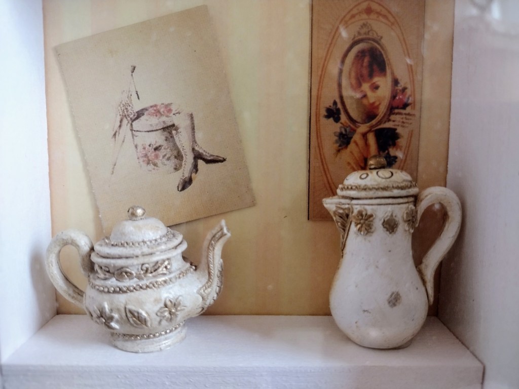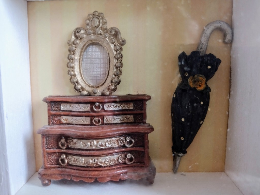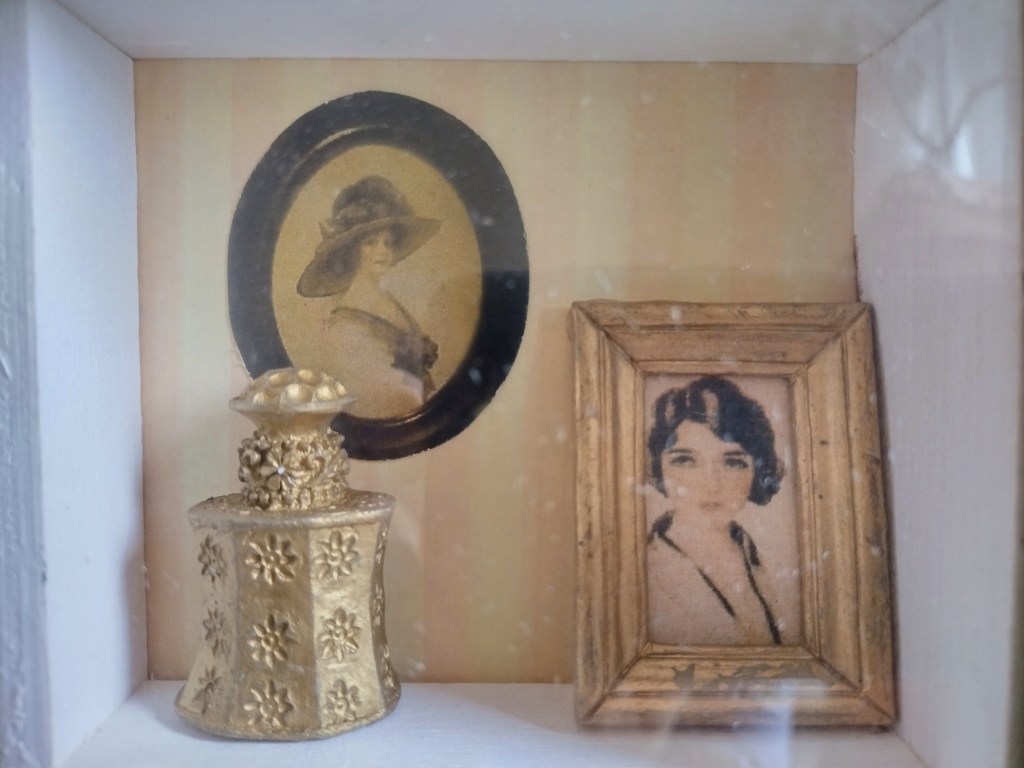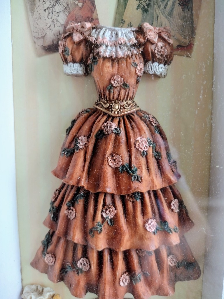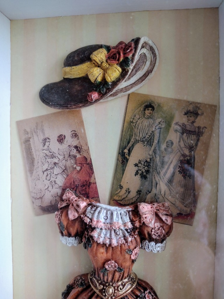 Last night I came home to find this shadowbox on the table in the lobby of the building where I live. After the super confirmed a tenant left it there as a freebie, I claimed this for my own. I’m going to hang it right above the table where I sew and draft patterns. It unifies that corner of the room into a statement. Now I feel the sewing corner has a strong visual and emotional impact. As someone who loves taking inspiration from the past, be it fashion or tea time, this shadow box is rich in meaning on so many levels.