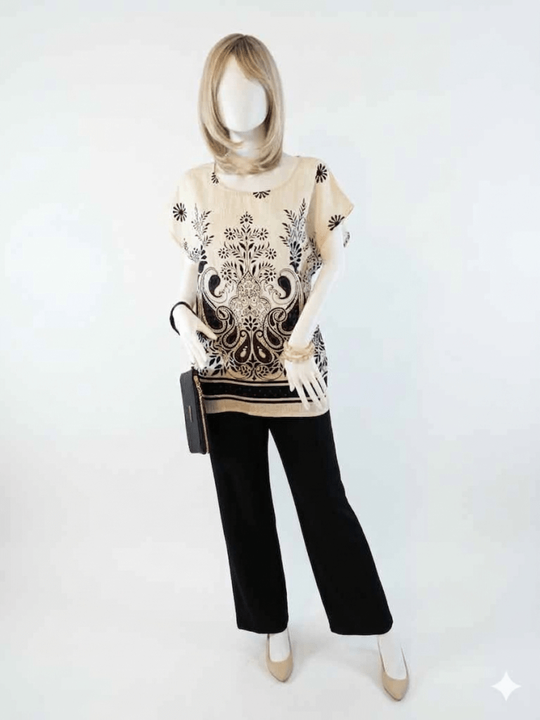 The centerpiece is this stunning paisley-print tunic. Upon closer look, it features tiny white crystals that catch the light—a subtle “mood booster” for those gray, overcast mornings. It provides that much-needed feeling of spring brightness while the weather is still catching up.