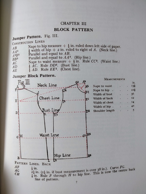 I bought this book through Amazon under the title “Pattern Making: Drafting 1930s Lingerie, Blouses, Skirts & Sportswear Fashions” by Gertrude Mason. The book was originally titled “Gertrude Mason’s Pattern-Making Book” and published in the U.K. in the 1930s. Ms. Mason was, according to the title page in the reprint I purchased, “a lecturer demonstrator in needlework, dressmaking and tailoring under the Board of Education, The Birmingham Education Committee and the Kent Education Committee.”