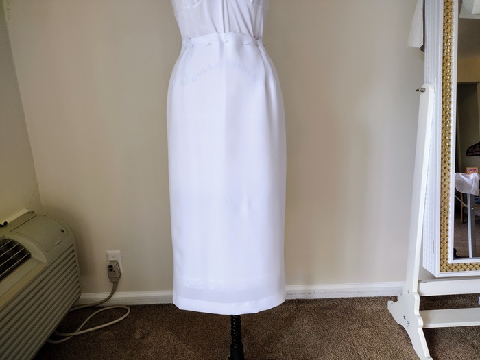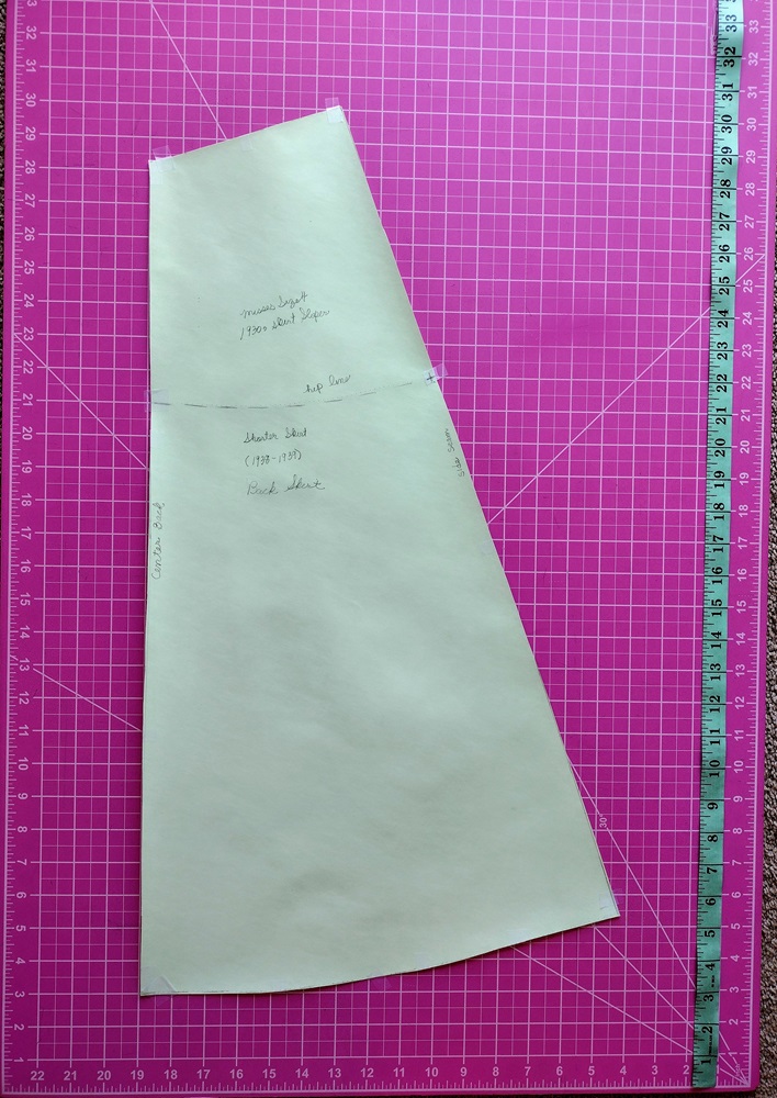 I then tried drafting the basic skirt pattern using the measurements from my Misses Size 8 dressform. Following the instructions I ended up with a very large back dart on the skirt. I divided the width into three separate darts. Still the skirt did not fit well across the front. The front ended up not being dartless but needing one dart on each side of center front. The resulting skirt was wide at the bottom but did not have the flow and movement of a modern A-line or flared skirt.