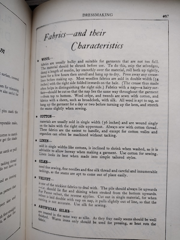 As always, research and reading provide insights and ideas. I begin this journey by making available for you a section of Weldons Encyclopedia of Needlework from my very small collection of vintage sewing books. It was published by The Waverley Book Col, Ltd. of Farringdon Street, London, E.C. 4, but no date of publication exists in the book! I estimate that the edition I have was published in the 1930s. As you can see in the illustrations that follow, the silhouette is close to 1930s fashions with longer hemlines and flowing skirts. The fashion figure is also slender and soft. The boxier fashions with emphasis on the shoulder line of the 1940s is not present in the chapter I post here.