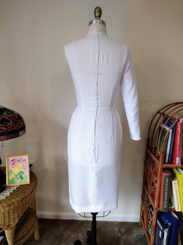 I used draping to create a highly structured bodice more suitable for 1950s styles along with a pencil/sheath style skirt. The only thing I did not like about the 1950s style bodice was that it was too, too structured for me. I created a bodice with a vertical dart above and below the bust. The fit was balanced but I did not care for how pointy and emphasized the apex was.