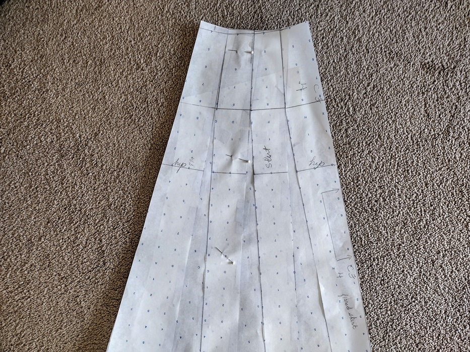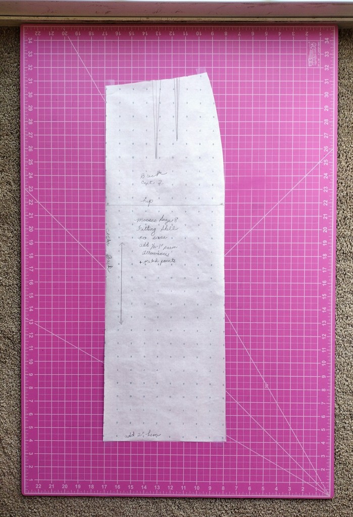 Three inches of ease at the hips and 1 1/2 inches of ease at the waist was added to the basic straight skirt drafted as the basis for this flared skirt.