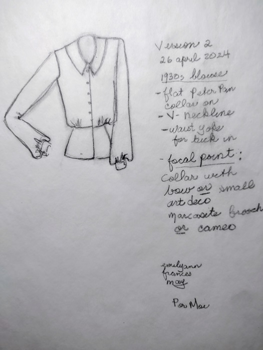 1930s skirt and blouse sketches and notes, Version no. 2.