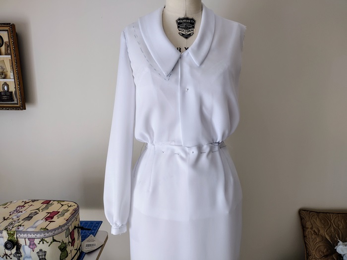 One of the difficult details for me in recreating a 1930s inspired blouse was training my eye and mind to accept a wide, flat fitted collar. On the right hand side of the collar in the photo is the narrow collar I started with. I thought this would look better. As I thought about it I realized that I am thinking too much of the narrow Peter Pan collars of 1950s dresses and blouses. I have experience with those, but not with the bolder, wider styled collars of the 1930s.