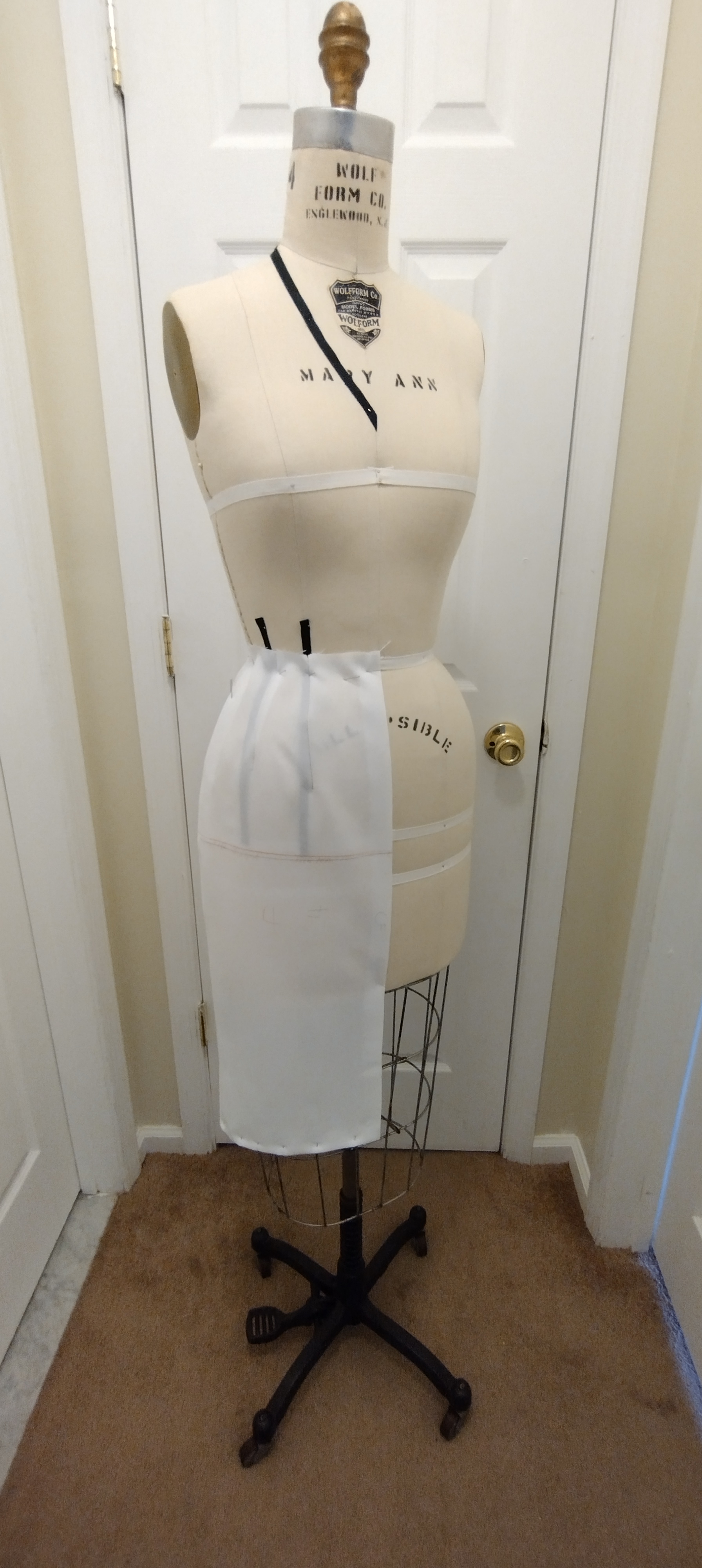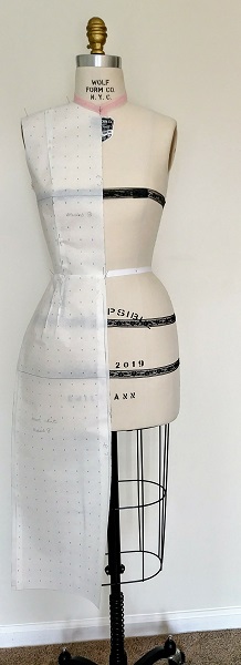 I used draping to create a highly structured bodice more suitable for 1950s styles along with a pencil/sheath style skirt. The only thing I did not like about the 1950s style bodice was that it was too, too structured for me. I created a bodice with a vertical dart above and below the bust. The fit was balanced but I did not care for how pointy and emphasized the apex was.